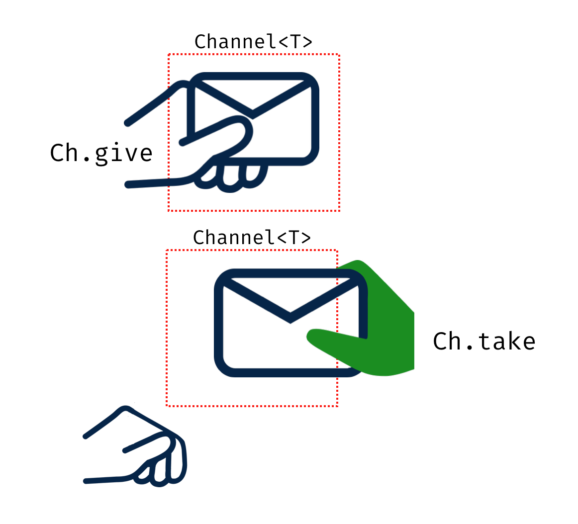 In communication via Channels, the producer give the message to the Channel (Ch<T>) and waits until a consumer take it from the Channel (Ch<T>)