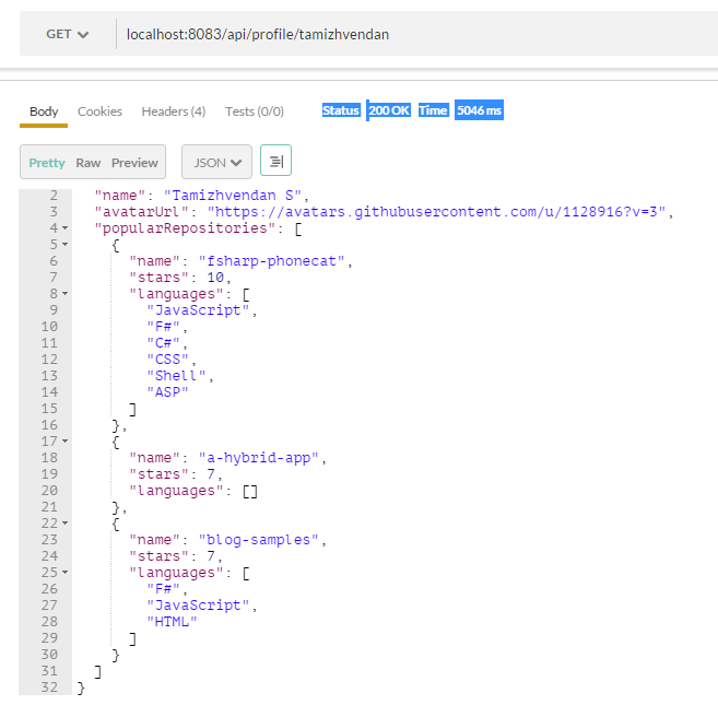 Hit F5 and access the API at http://localhost:8083/api/profile/{github-username} Bingo!!