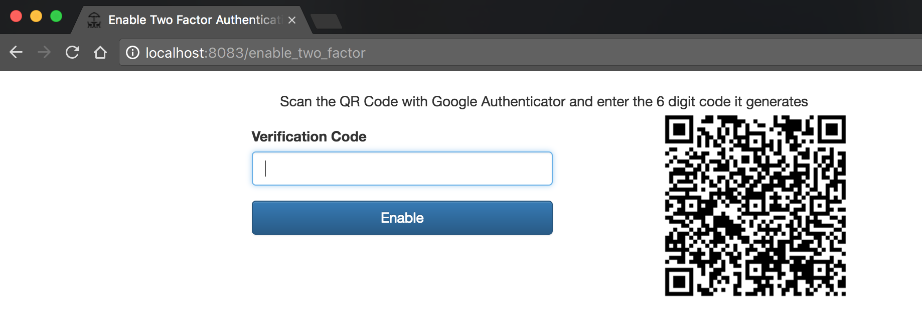 <input type="hidden" name="SecretKey" value="">Now we need to render the enable_two_factor page in response to the HTTP GET request /enable_two_factor