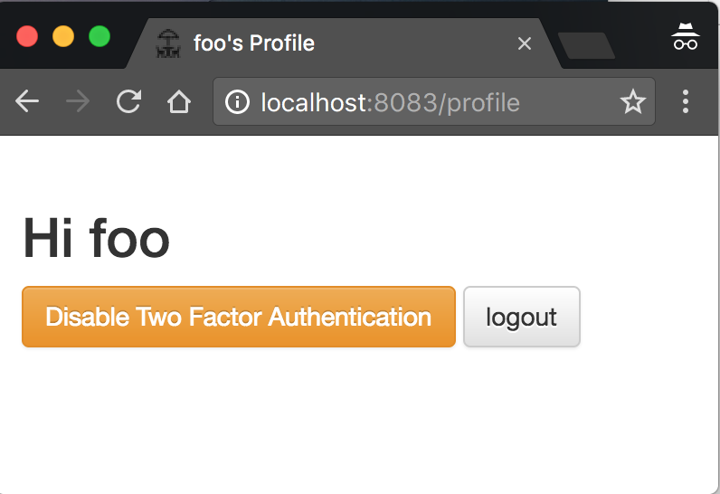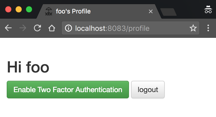 After successful login, the user redirected to the Profile page where the user sees his name with a couple of buttons. One to enable Two-factor authentication and another one to log out