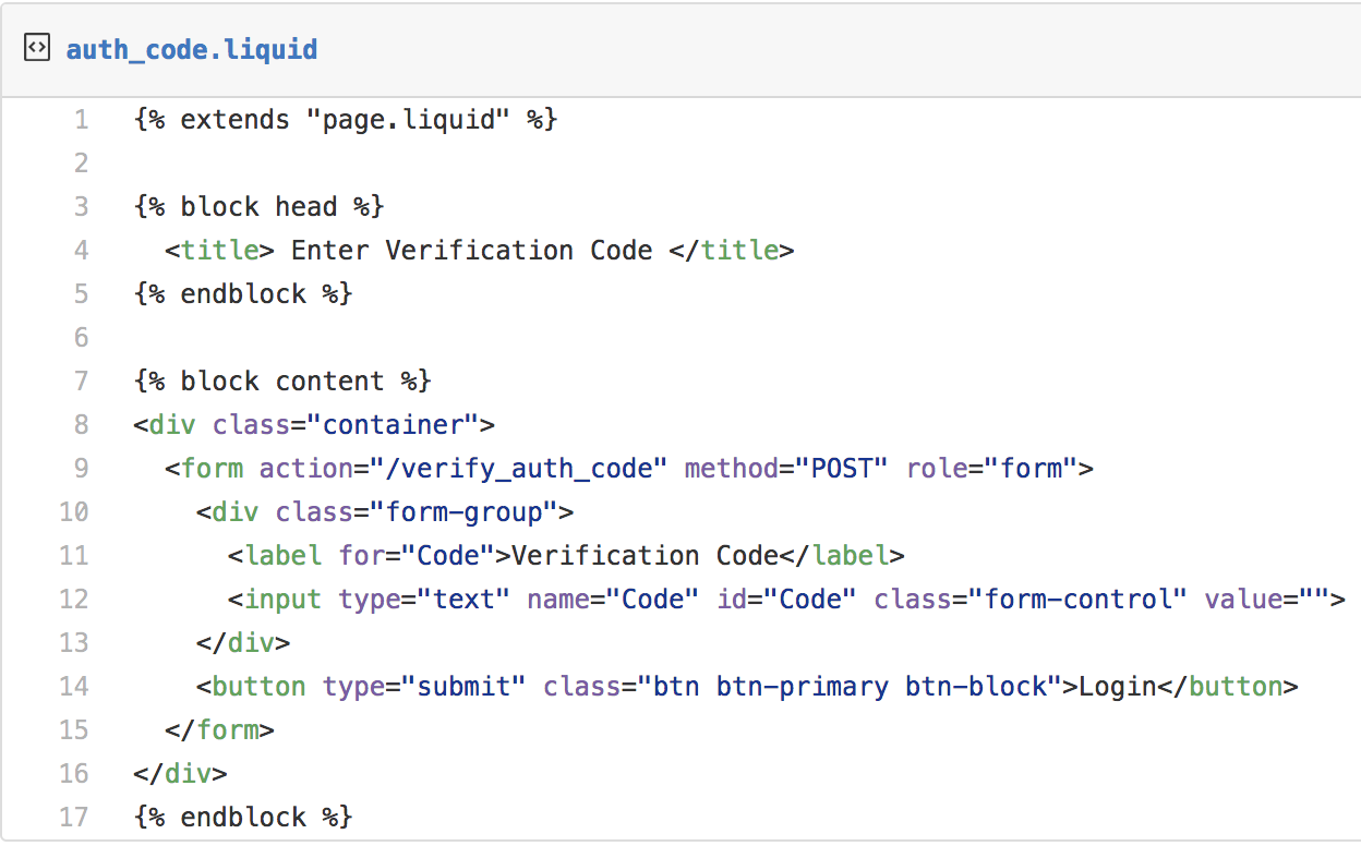 Let's start by defining the liquid view template auth_code.liquid for getting the one-time verification code.