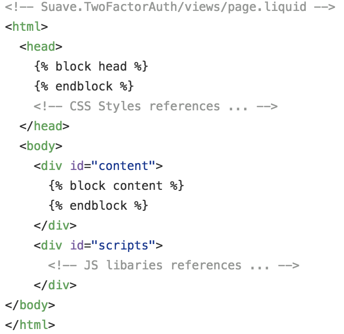 Create a new directory with the name views in the Suave.TwoFactorAuth project and add a new liquid template page.liquid. This page.liquid is the master template for our application