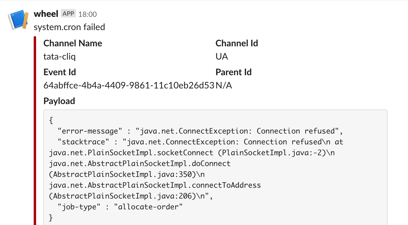 :level :error)))If we stop the fake API server for a moment, we will get the cron-job notification in the slack when the cron job got triggered.