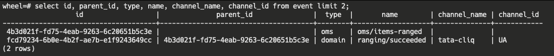 {:started [...]}Then put the valid XML ranging message of channel UA in IBM-MQ, we should be able to see the new events in the database.