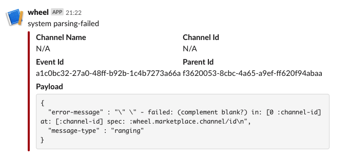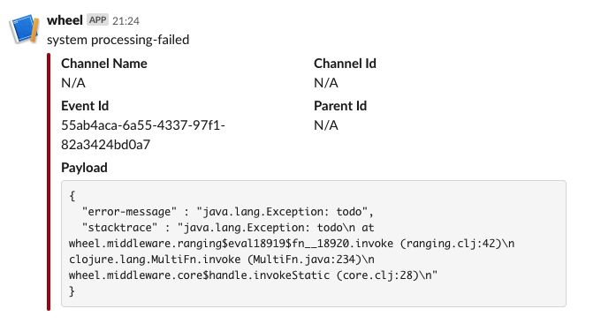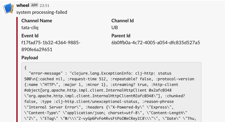 + (s/keys :req-un [::id ::name ::type ::level ::timestamp ::payload]))System Processing Failed Event