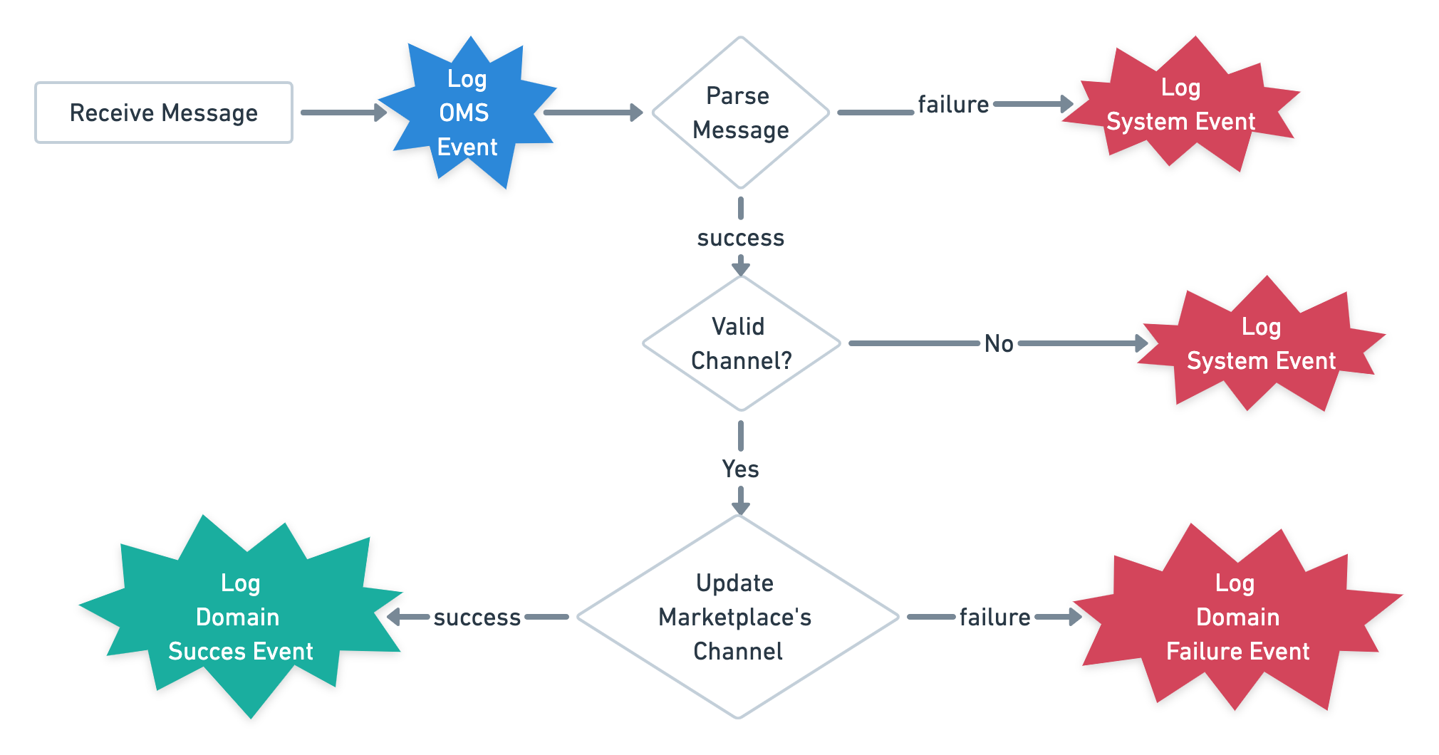If the channel exists, we will be performing the respective operation in the marketplace. If the processing succeeds, we log it as a domain success event else we log it as a domain failure event.
