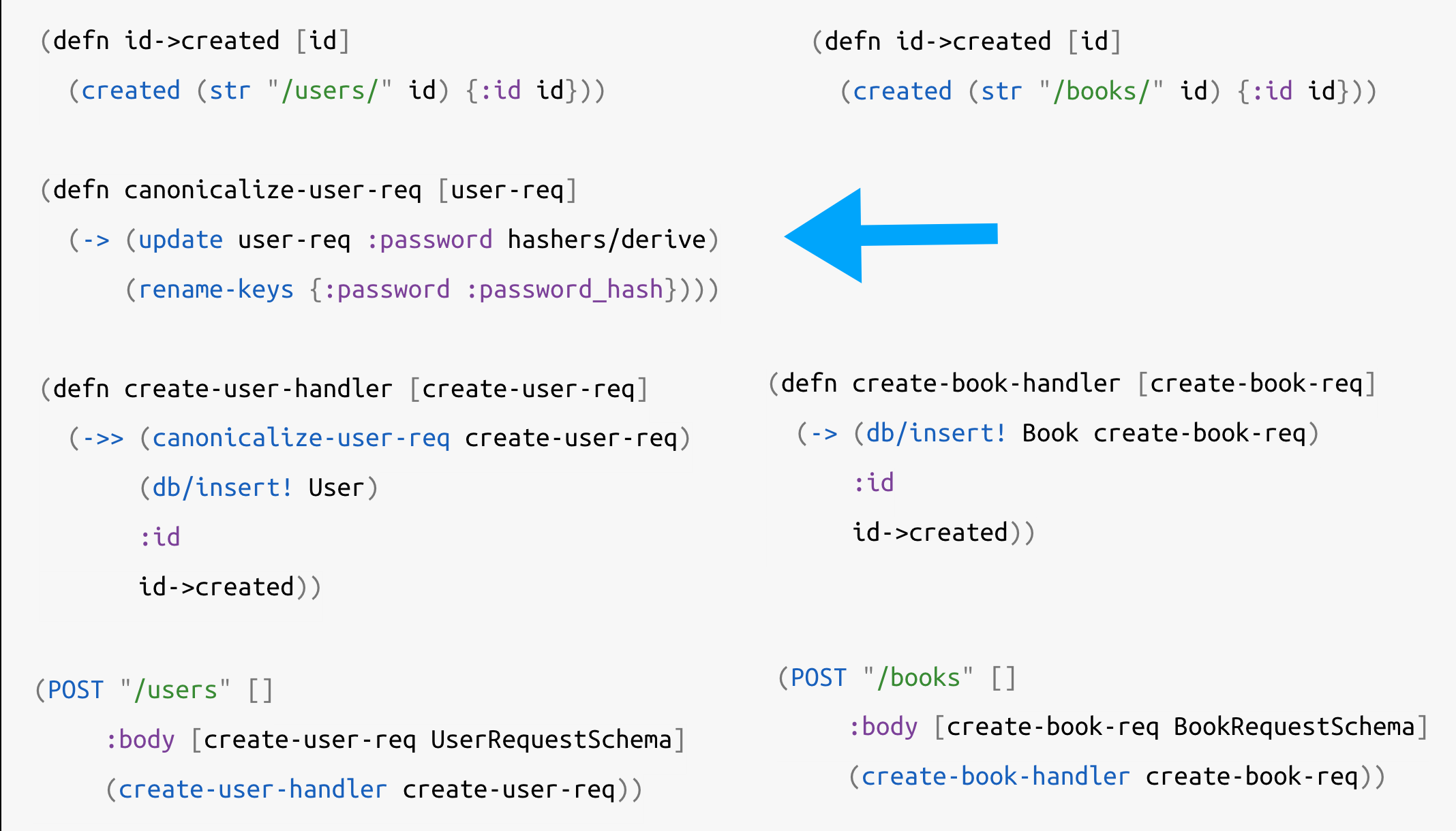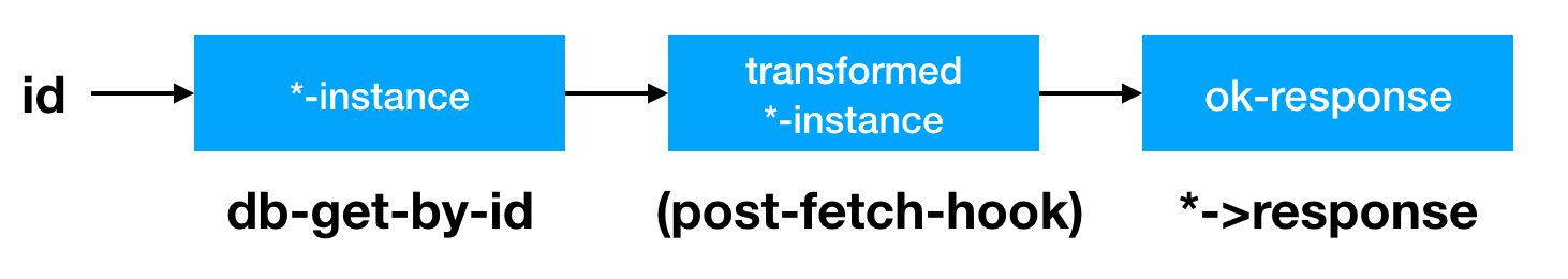 As depicted in the image, in get-user-handler we dissoc the password_hash from the user instance. Again this can be viewed as a pipeline, where need a hook to transform the instance retrieved from the database.