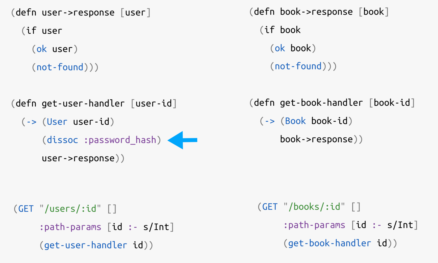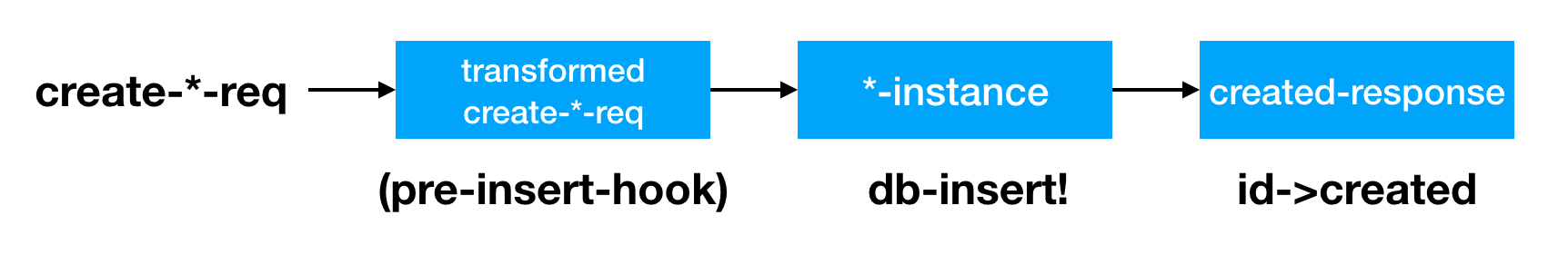 As depicted in the image, in get-user-handler we dissoc the password_hash from the user instance. Again this can be viewed as a pipeline, where need a hook to transform the instance retrieved from the database.