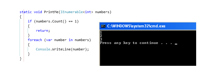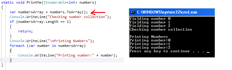 Now can you able to find the exact issue associated with the method “PrintMe”? The red lines are areas of concern. The list is yielded twice!! One while using the Aggregate Operator of LINQ “Count” which causes immediate execution results enumeration all the yields and the second one is yielding the list once again lazily when enumerating through “foreach” loop.