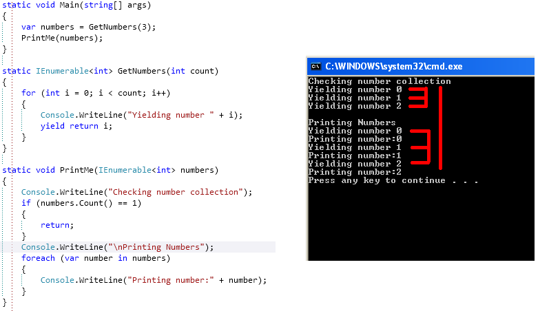 I have added some code in “PrintMe” method to log how it is actually getting executed. Also I have added the “GetNumbers” method which lazily creates a list of numbers using yield statement.